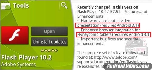 Flash Player升级描述中出现了“Android 3.1”字样 据报道,这项升级将能够使得Android平板设备能够流畅播放720p的网页内嵌式的Flash视频。不过随后不久,很可能是迫于谷歌的压力,Adobe对其作出了修改,将“Android 3.1”改为“一项即将到来的Android 3升级”(下图)。