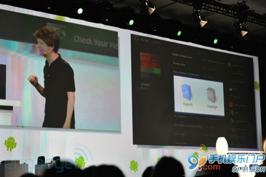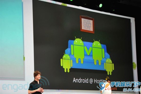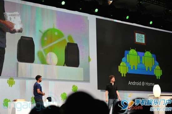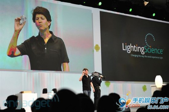 Google已经开发了一套完整的协议,来搭建整个自动化框架,让所有Android设备和第三方配件进行连接和沟通。 首先就家庭自动化来说,洗衣机会根据你手机中的日程安排自动运行,灯光照明会根据你玩游戏的情绪调整照明,温控系统则通过手机里的天气预报信息来控制温度等等,这个绿色的机器人会进入到你生活的每个角落。 Google已经设计了一个可控的Tungsten照明插座,今年年底开售,可以用手机调明暗。另外还有支持NFC标签的CD,手机或者平板读取信息之后,会把专辑加入到播放列表中,自动从云端下载整张专辑。 家中的所有电器设备都将会通过Android手机、平板、电视机进行集中控制,而第三方配件标准的出台,会吸引家电厂商推出各种各样的Android系电器产品,届时Android将不仅仅是一个移动应用系统平台。