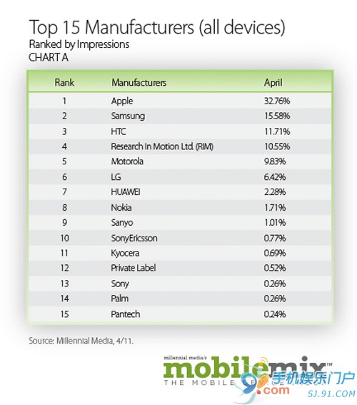 美国移动广告网络公司Millennial Media今天公布报告称,谷歌Android操作系统4月份继续在全球智能手机的广告市场上占据主导地位,所占份额为53%。 报告显示,苹果iOS排名第二,所占份额为28%;RIM黑莓操作系统第三,份额为16%;Symbian、Windows及其他系统所占总份额为4%。 但报告同时指出,虽然谷歌在智能手机数量方面继续占据领先地位,但从应用营收来看占据头名位置的仍是苹果。报告称:“4月份来自于iOS平台的应用营收环比增长6%,按应用营收计算,苹果在我们网络上所占份额为50%。”与此相比,Android所占份额为39%,RIM为9%,分列第二、三位。 报告还表明,游戏、移动社交网络、音乐和娱乐应用是下载量最高的应用类别。