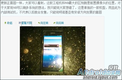 诺基亚CEO斯蒂芬埃洛普曾公开表示过,诺基亚曾经花了几秒钟考虑是不是要推出Android的产物。然而或许就是这数秒间的考虑催生了今天某微博网友曝光出的一台外形酷似N9的搭载Android系统的测试机型。 据该微博消息称,诺基亚内部正在测试一款代号为NB72的新机型,采用Android 2.2版系统,硬件信息未知,整体运行速度流畅,配有4英寸800×480像素触摸屏,不能拆换电池。而外形方面与N9的最大区别在于多了一个前置摄像头。这样一来诺基亚旗下就有着Symbian、Android、MeeGo以及WP7四种系统的机型,或许诺基亚会通过四种不同系统的机型的销售情况来衡量市场前景,借此为将来夺回绝对的霸主地位做好准备。