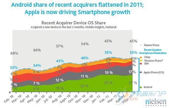北京时间7月1日消息,据国外媒体报道,2010年Android手机份额激增,有部分人士称,这是由于iPhone在美国只有AT&T一家运营商销售,给Android制造了增长机会。 今年2月,Verizon开始销售CDMA版iPhone 4。而尼尔森本周四的报告显示,2011年Android手机在新购机用户中的增长趋于平缓,iPhone则继续引领智能手机的增长。