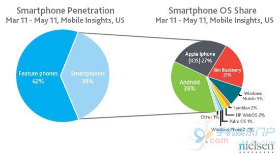尼尔森数据显示,美国智能手机市场份额在不断扩大,其中Android占据38%(3月-5月)的市场,比2月-4月的份额高出2%。同期苹果增长1%至27%,RIM的份额下降2%至21%。 目前38%的美国手机用户拥有智能手机,而过去3个月购买智能手机的人群比去年增长了34%。