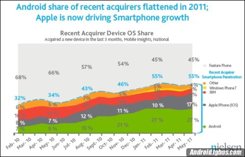 根据Nielsen发布的移动市场最新调查显示,截至6月份,Android操作系统在过三个月以38%市占率在美国智能手机市场仍居龙头,其次是iPhone则27%,而Blackberry平台就余下21%份额。