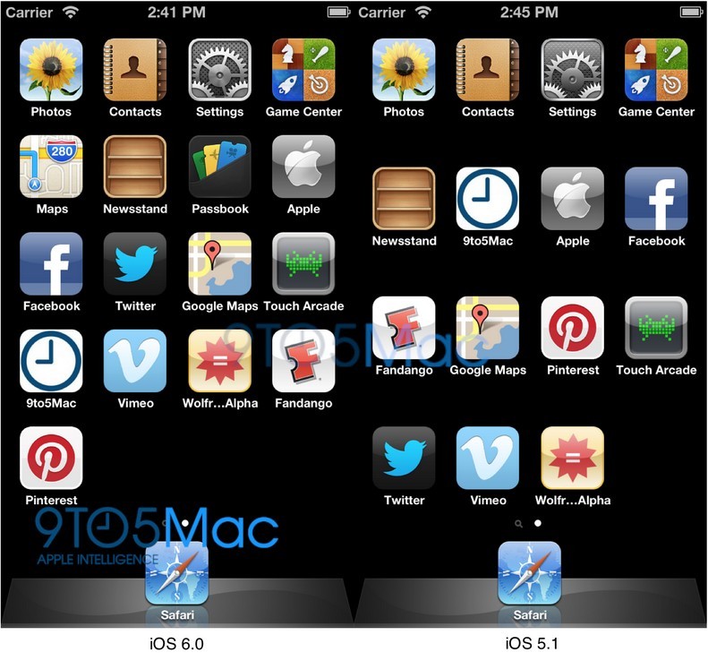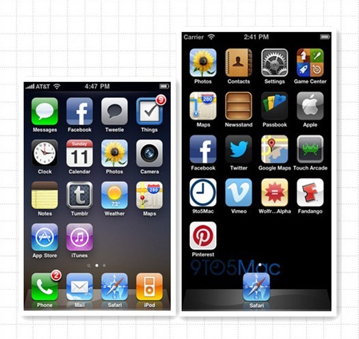 iPhone 5 也许下个月即将发布了,更大、4英寸的屏幕是用户们最期待的事情之一,而且是在宽度不变,高度增加的基础上。而今天这个消息将很快验证,9to5mac 得到的可靠资源透露苹果正在测试新的界面支持怎样的图标排列。 新iPhone 主界面包含了5排应用图标,比3.5英寸的4排应用多了一排,整个用户界面也得以调整,以来更好地适应新界面。 因为9to5mac已有iOS开发工具中,有预装好的iOS 模拟应用,9to5mac便直接在640*1136分辨率的界面上运行已经发行的iOS 5.1和 iOS 6.0,运行 iOS 5.1 时主界面上是4排图标,且图标间隙较大,跟整个屏幕不是很协调;运行iOS 6时, 主界面上却显示了5排图标,视觉上协调性也不错;这个证明即将面市的iOS 6 是专为 下一代 iPhone 设计的,它很完美地适应了新的更高的显示屏。 另一个证据是,如果是其它的分辨率,图标会扩展到一个类似iPad主屏幕布局,这个显然不适合iPhone 。 下面来看看新旧对比图: 正常的3.5 英寸和4.0英寸界面对比: