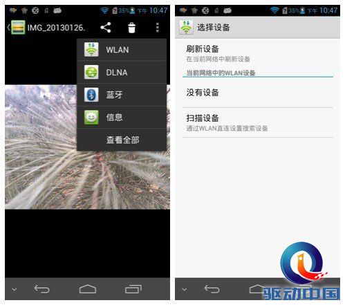 华为Ascend D2视频兼容能力出色 另外,在图库的分享功能中,还可以发现华为Ascend D2的一项隐藏功能,即WLAN显示,支持将图片直接传输到支持该功能的显示设备上。当然,华为手机一贯内置的DLAN传输功能也出现在该机上,可以分享图、音乐、视频等多种媒体内容,配合流行的电视盒或是智能电视,可以方便地享受数字家庭的乐趣。