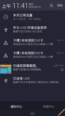 ▲通知栏界面 其中快捷中心是一个较为亮眼的设计,分为通知中心和快捷中心两部分,它将计算器、手电筒、拍照这些常用应用以快捷图表形式呈现在下拉菜单里,大大节约了搜索时间。