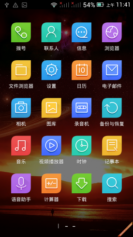 ▲主界面 Nibiru H1系统传承叶子造型的经典设计,融合线条设计理念,并加入缓动动画,使整体看起来更简洁实用。