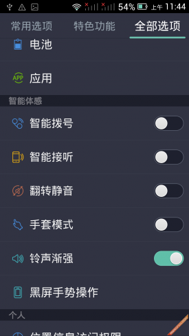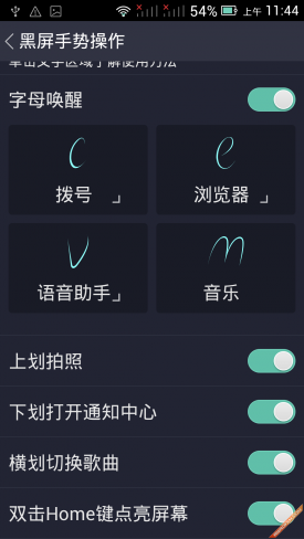 ▲设置界面 Nibiru H1还有一个超智能应用体验功能,即黑屏自定义手势唤醒功能。在黑屏状态下输入C,即可进入拨号应用,但同时也可以转换成进入相机或者图库应用,可随心所欲的设定。