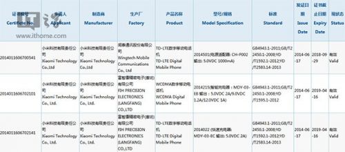 前些日子小米官方宣布小米手机3以1499元的价格现货供应,这就意味着小米新品离我们已经不远了。日前三款小米新品智能手机通过国家质量中心的认证。 从国家质量认证中心官网可以查到近日型号为“2014501”、“2014215”、“2014022”的三款小米新机已于6月17日获得认证,根据以往的经验和曝光的部分规格信息可以推断前者属于红米系列,后者则是新款小米手机。如果不出意外的话,三个型号对应的机型应该分别是:红米Note 4G版、小米3S以及小米4。