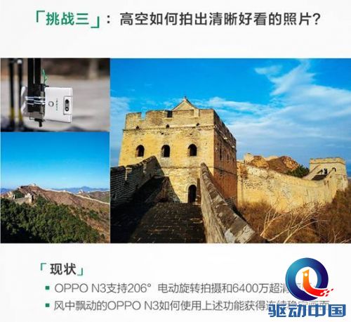 对于一些爱好旅行但没时间出门的用户来说,安装一些720°全景旅行应用,就能饱览美景了。你知道这样的全景照片是如何拍摄的吗?这其中往往就需要利用无人飞行器搭载大型数码相机飞到天上去拍了。 OPPO手机在过去,成功的拍摄过杂志封面大片。这一次OPPO将使用无人飞行器搭载目前拍照最好的安卓智能手机——OPPO N3,去挑战720°飞天拍摄,这是一次史无前例的创举! 勇气和创意满满,但OPPO N3在天空拍摄720°全景照片,困难重重挑战多。不稳定怎么办?距离太高遥控不便怎么办?天气不好怎么办?这些不确定因素,都会影响这次挑战是上天还是上西天。 飞的稳定还得耐摔 如何将OPPO N3送上天,而不是送上西天,就是OPPO需要考虑的问题。传统专业的数码单反相机,由于自身重量比较重,因此在天上飞行的时候,相对来说就比较稳定。而轻巧的OPPO N3更容易受到飞行器本身的稳定以及外界风力的影响,风大时不可避免会吹翻飞行器,机身如果不够坚固,在拍摄还没有完成之前可能手机已经被摔坏。