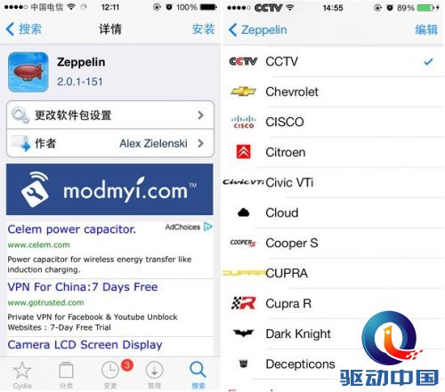安装方法:可直接在cydia上搜索安装Zeppelin。然后前往设置找到Zeppelin,就能修改运营商图标。