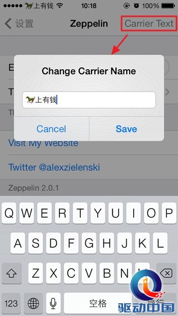 另外,Zeppelin还能修改运营商文字,从设置进入Zeppeliin,点击右上角的【carrier text】,即可输入想要的文字,保存后即可生效(如果开启了运营商主题的功能记得先关闭,修改文字才会生效)