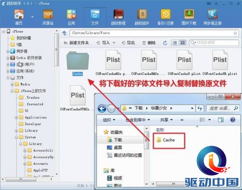 然后将下载好的字体文件包中的Cache文件夹导入到该路径,复制替换原文件。