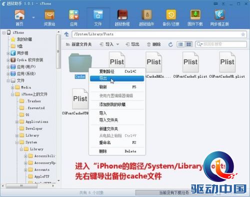 iPhone系统自带的字体想必大家都看腻了吧,可是iPhone本身又不支持用户自己改字体,只有越狱后的设备才有权限做到。小编从网络上收集到了一些字体文件(点击下载华康少女+华康pop+雅圆字体文件:http://pan.baidu.com/s/1bntKrM3),欢迎越狱用户来尝试。 首先,修改字体需要越狱助手能修改系统文件的工具。安装越狱助手后,切换到文件界面,进入“iPhone的路径/System/Library/Fonts/”可以看到Cache文件,请先右键导出备份,以备不时之需。