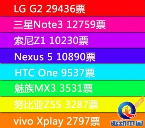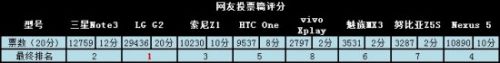 ●票数:根据投票结果进行依次评分和排名,最终结果为LG G2>三星Note3>索尼Z1>Nexus 5>HTC One>魅族MX3>努比亚Z5S>vivo Xplay。