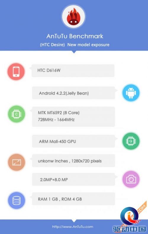 目前只知道这款手机的代号是HTC D616W,采用了联发科MT6592八核处理器,主频范围728MHz~1664MHz,集成Mali-450 GPU显示核心。屏幕的分辨率为1280x720,屏幕物理面积应该在5英寸左右。另外内存采用了1GB RAM+4GB ROM的组合,摄像头方面是200w前置摄像头+800W后置摄像头,运行android 4.2.2系统。