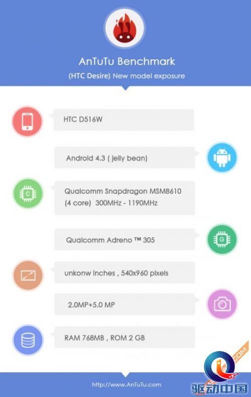另外一款新机型号是HTC D516W,从硬件来看这款产品则是定位于更加入门的级别。HTC D516W采用了高通骁龙200(MSM8610)四核处理器,主频范围300MHz~1190MHz,由四个ARM Cortex A7核心组成 ,集成Adreno 305 GPU显示核心。这款设备屏幕的分辨率为540x960,内存采用了768MB RAM+2GB ROM的组合(猜测可以扩展内存卡)。摄像头方面是200w前置摄像头+500W后置摄像头。运行android 4.3系统。