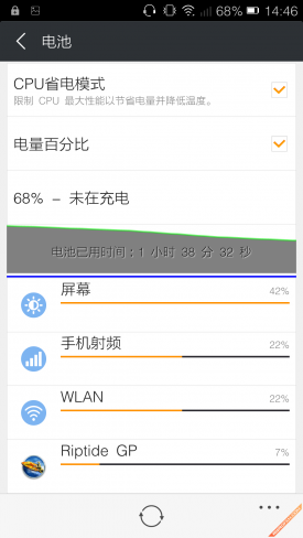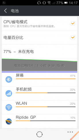 WIFI情况下,使用土豆客户端在线播放视频,测试半小时后电量由77%降至68%,共消耗9%电量。