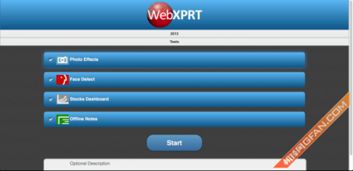 大家要运行WebXPRT2013,可以直接访问http://www.principledtechnologies.com/web/webxprtworkload/网站,在打开网页后,直接点击网页下方的Start按键即可开始测试。测试完成之后,就可以直接得出浏览器的具体性能得分了。