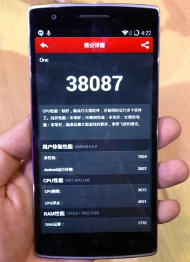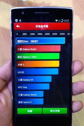 在配置上,一加手机的处理器采用了高通骁龙801处理器、主频2.5GHZ,内存组合3GB RAM+16GB ROM,摄像头采用1300万像素+前置500万,电池容量3100毫安。笔者在现场对其进行了安兔兔跑分测试,成绩非常惊人,高达38000+。