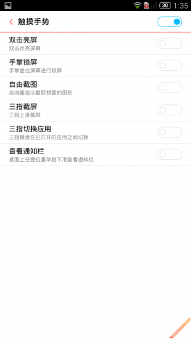 触摸手势可实现三指截屏、三指切换应用、任意截图和查看通知栏。体感操作可实现翻转静音、甩动切歌、晃动更新、晃动清除,更有全新交互改进和多项视效设计,带来超酷交互体验。
