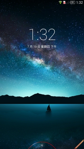 锁屏界面,在下方的红色圆环处向上小幅滑动解锁,大幅滑动打开相机。另外,在锁屏状态下还可显示信息提示卡、快速浏览照片。