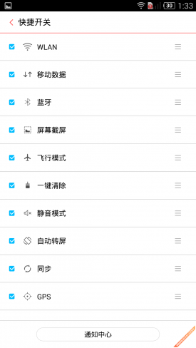下拉通知栏采用单页模式,快捷开关在屏幕下方,带有屏幕亮度调节,上方则为通知页。