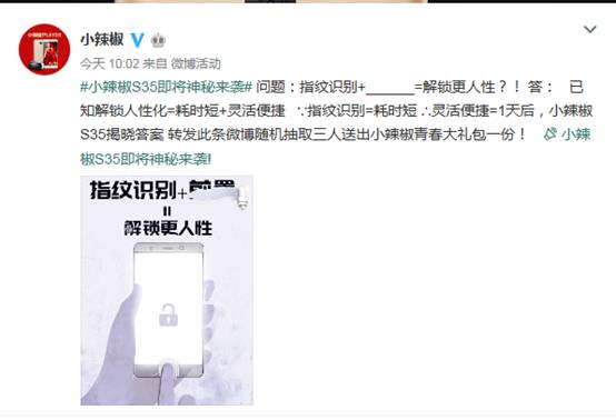 值得一提的是,今天是小辣椒S35倒计时的最后一天,“指纹识别+前置等于解锁更人性”,这将意味着小辣椒S35支持当下流行的屏幕解锁、一指付和支付宝指纹支付等便捷功能。从整体上来看,小辣椒此次命名为S35的新品将主打大屏和趣味拍照功能,定位于高性能娱乐市场,前置指纹体验感更强,符合当下年轻人的需求。