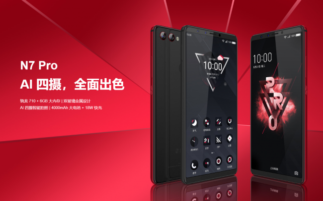 360手机N7 Pro搭载高通骁龙710处理器,配备6GB运行内存和64GB/128GB机身存储,同时在7.7毫米厚的机身内部放下了4000毫安时容量电池。据官方介绍日常使用可续航两天,支持18W快充,20分钟可充电30%,100分钟可充满。