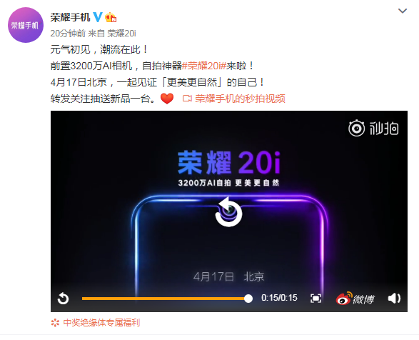 今日荣耀手机微博官宣称搭载前置3200万像素AI相机荣耀20i将于4月17日在北京发布,更美更自然!作为荣耀数字旗舰机型荣耀20目前还未有官方消息,但不曾想荣耀20i先人一步先行发布!