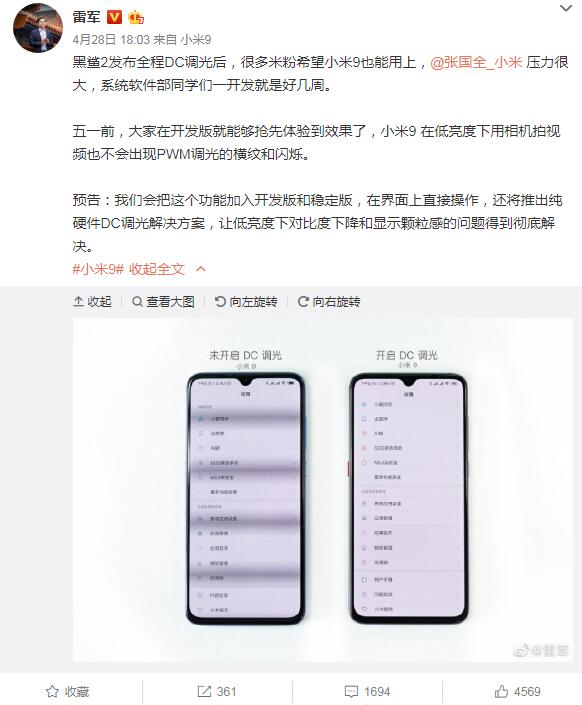驱动中国2019年4月29日消息 前段时间,OLED屏幕上进行DC调光可谓是手机行业最火的话题了!随后黑鲨、OPPO、魅族、红魔等厂商发布的新品上都加入DC调光功能!昨天,小米雷军在微博表示小米9在五一前开发版就已经可以抢先体验到效果!