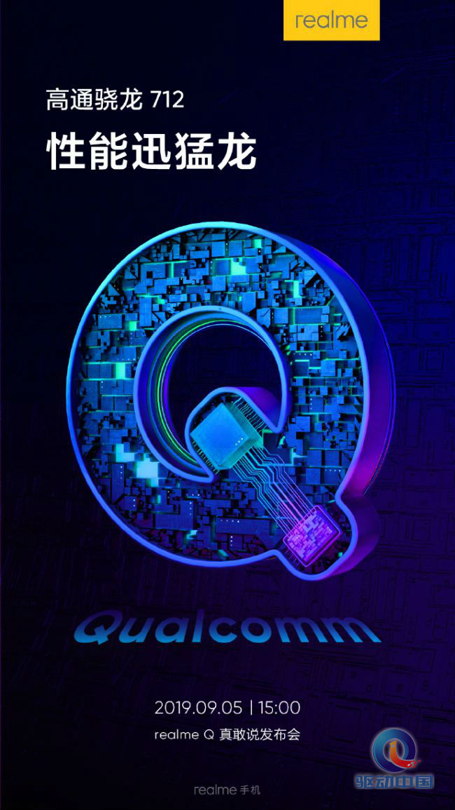 驱动中国2019年8月29日消息, 今天上午,realme在微博官宣其即将发布的realme Q将搭载高通骁龙712处理器,将于9月5日举办发布会正式发布。