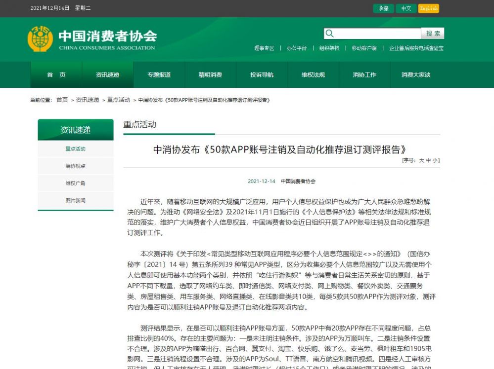 驱动中国2021年12月14日消息,中国消费者协会今天发布《50款APP账号注销及自动化推荐退订测评报告》显示,在是否可以顺利注销APP账号方面,50款APP中有20款APP存在不同程度问题,占总排查比例的40%。