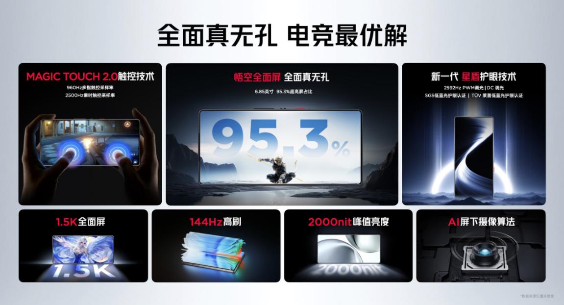 作为屏下技术的领航者,红魔在屏下技术上已经迭代到第七代。红魔10S Pro系列搭配6.85英寸、屏占比高达95.3%的悟空全面屏,做到全面真无孔,带给用户极具冲击的视觉体验。屏幕的1.5K分辨率、2000nit峰值亮度与144Hz自适应高刷组成视效黄金三角。极窄1.25mm黑边让游戏体验更胜一筹。
