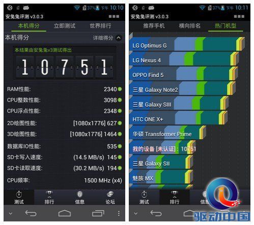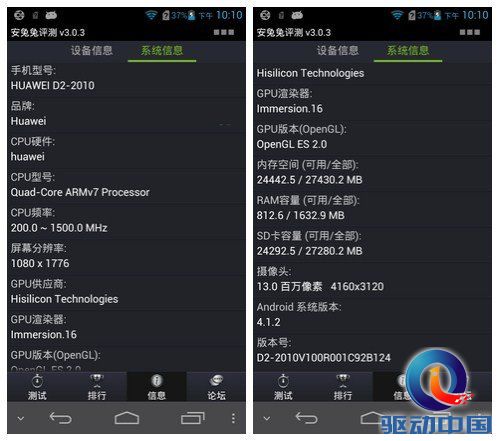 华为Ascend D2硬件配置信息 首先是安兔兔评测,可以看到,华为Ascend D2一万出头的得分并没有像预想的那样大幅超出Tegra 3机型。从得分项目中观察,处理器、RAM的得分虽然略低,但考虑到架构和制程,也是在合理范围;而3D绘图性能的部分则明显低于同类高通apq 8064机型(OPPO Find 5为4600余分)。