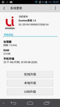 界面及系统:Emotion界面 去除主菜单 华为Ascend D2搭载了android 4.1.2系统,并在此基础上定制了“Emotion”系统,版本为1.5。说白了,就是一个华为专属的深度定制的界面,只是相比之前的产品有了一个正式的命名。而在布局方面,也有一些变化,对于华为老用户来说,可能需要时间适应。