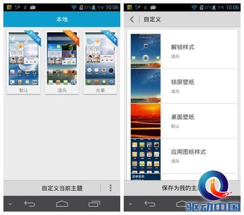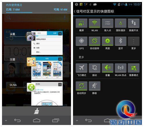 华为Ascend D2支持主题及自定义功能 华为Ascend D2还针对一些细节操作部分进行了优化,比如多任务管理器支持一键清除功能,集成在下拉状态栏中的快捷操作图标,也可以进行自定义,将常用的开关放置进去,使得操作更加方便。