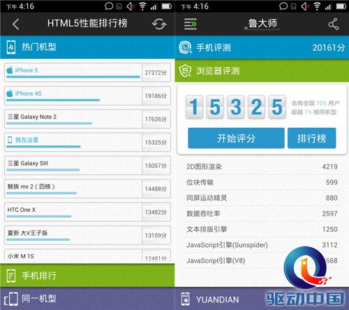 处理器:冷艳高贵接地气 原点并没有使用高通抑或三星的处理器,而使用了MTK6589四核1.5Ghz处理器,一方面可能因为节约成本,另一方面MTK在散热方面做的相对好些,在使用过的很多安卓手机中原点是将散热控制的不错的手机,刷微博微信玩儿“节奏大师”这样的游戏几乎没有感受到热。那我不免俗的用安兔兔之类的跑分软件走一个,测试软件鲁大师,我个人不迷信跑分,毕竟上手体验是更重要的,尽信书不如无书: