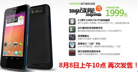 这艘搭载了高通骁龙S4超级“芯”,装备4.5寸HD高清视网膜屏、大金刚二代玻璃的海尔超级战舰,自从7月3日的发布会以来,就一直备受广大网友的关注!海尔超级战舰的各方面配置均处于当今智能手机产品的一流水平,售价定于1999元,可以说更加凸显了海尔超级战舰超高的性价比,在前两次的发售中,4万台海尔超级战舰被抢购一空!
