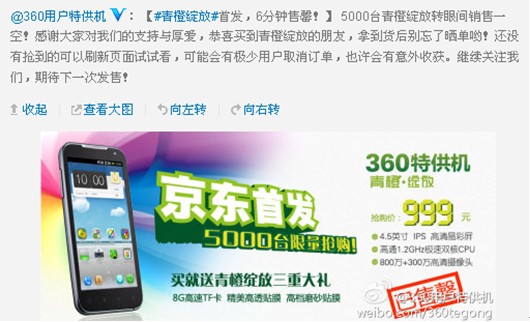 青橙绽放首发5000台以999元的冰点价登陆京东商城,彻底击穿市场底线的价格让粉丝几乎疯狂。仅6分钟时间5000台一售而空,速度之快,时间之短,创造360特供机销售记录。没有抢到新机的网友不断在青橙官网、官方微博留言,可见青橙绽放超高性价比爆发出的惊人能量。
