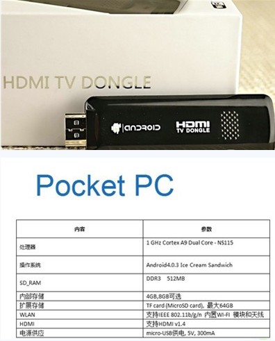 口袋电脑搭载新岸线NS115芯片,512MB DDR3内存,内部存储空间有4GB、8GB可选,支持TF存储卡扩展最大至64GB,内置支持IEEE 802.11b/g/n协议的无线网卡,拥有HDMI v1.4高清输出功能,采用Micro USB供电,预装谷歌Android 4.0.3操作系统。