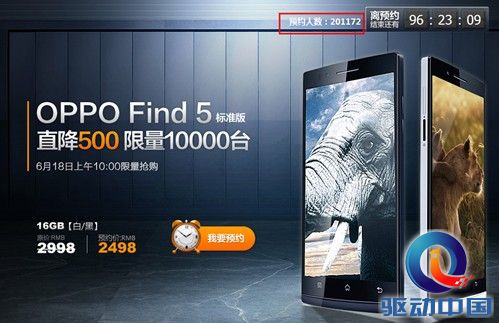 6月14日消息,昨日,OPPO Find 5正式开启直降500元的购买预约,截止到14号早上9点30分,预约人数为201172,突破20万大关,平均一秒就有两台的预约。