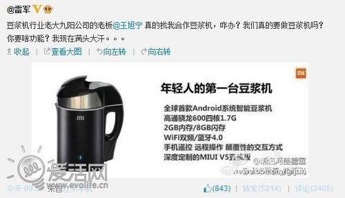 小米创始人兼董事长雷军也来“凑了一把热闹”,他在微博上@到了豆浆机老板王旭宁,为自己设计的杰作“小米豆浆机”宣传造势。