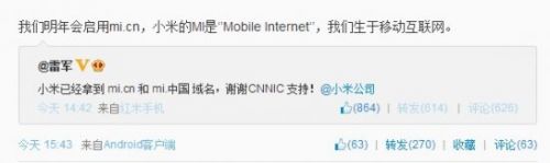 而小米创始人黎万强也表示:“我们明年会启用mi.cn,小米的MI是‘’Mobile Internet‘’,我们生于移动互联网。”