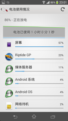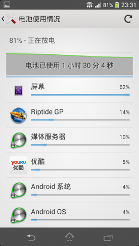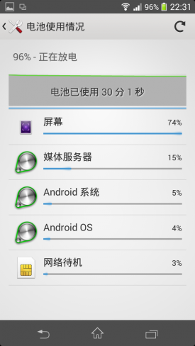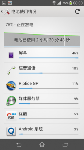 测试期间将屏幕亮度调整为50%、音量为50%,关闭数据交换并打开WIFI。另外,由于工作环境限制,在测试影音以及游戏项目时, 我们统一采用耳机模式,这也符合目前广大用户的使用习惯。整个续航测试项目共有五项,每项测试均为30分钟,测试项分别为播放本地视频、运行游戏、播放在线视频、播放本地音乐、拨打电话。经过测试后,最后统计剩余电量。在这样的测试模式下,Z1炫彩版剩余电量为75%,续航能力还是非常不错的,如果使用强度不是太多,基本上两天一充也是可以实现的。
