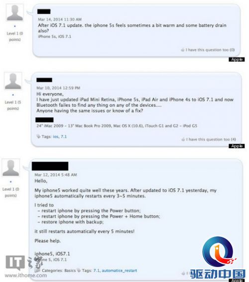 除了电池寿命大幅下降,这次更新似乎也严重破坏了蓝牙连接,导致时不时的重启。一个用户吐糟说以前自己的iPhone5s可以待机24小时,现在12个小时后就得充电。还有一个用户写道自己的iPhone5s、iPhone4s、Retina屏iPad mini 2和iPad Air自从升级iOS7.1后便无法连接蓝牙。