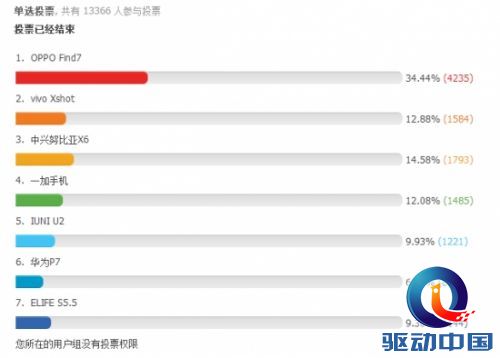 5月14日机锋论坛发起了《2014国产旗舰,选你的最爱》的投票活动(点击查看原帖),在短短的几天内,共有13366名机友热情参与。从投票结果显示,OPPO Find 7成为最受网友青睐的国产旗舰手机,超过1/3的用户喜爱这款国产手机;而被华为技术有限公司高级副总裁余承东抱有极高期望,宣称能销售1000万台的华为P7则表现不佳,仅有6.8%的用户投出了青睐票,是同期发布的国产旗舰手机中人气最差的一款产品。