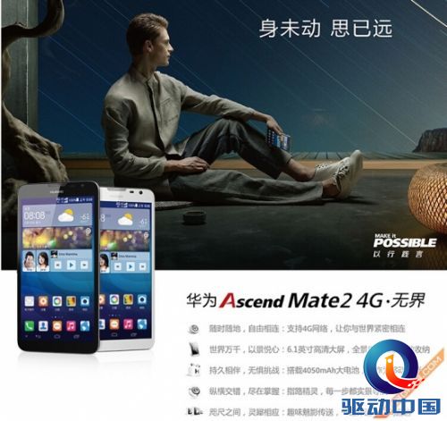 拍照方面该机有着前置500万像素和后置1300万像素镜头组合,并配备了4050mAh超大容量电池,支持移动4G网络。系统方面,则采用了自家的Emotion UI 2.0,它基于Android 4.2深度定制。