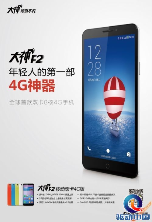 2014年8月26日,酷派正式发布了旗下新一代大神产品——大神F2,该机在配置方面,采用了联发科八核处理器,主频为1.7GHz,支持双卡双待功能,以及2GB RAM+16GB ROM组合。从配置来看,该机已经达到了目前旗舰阵列。