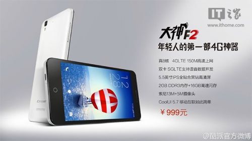 酷派大神F2采用5.5英寸720p显示屏,搭载联发科MT6592八核处理器,辅以2GB RAM和16GB ROM存储组合,配1300万像素主摄像头,支持4G双卡双待,搭载最新的CoolUI,内置老人模式,配备2500毫安电池,售价999元,8月27日10点起可通过京东商场、酷派商城、QQ空间等6大渠道预约,9月2日12点发售。